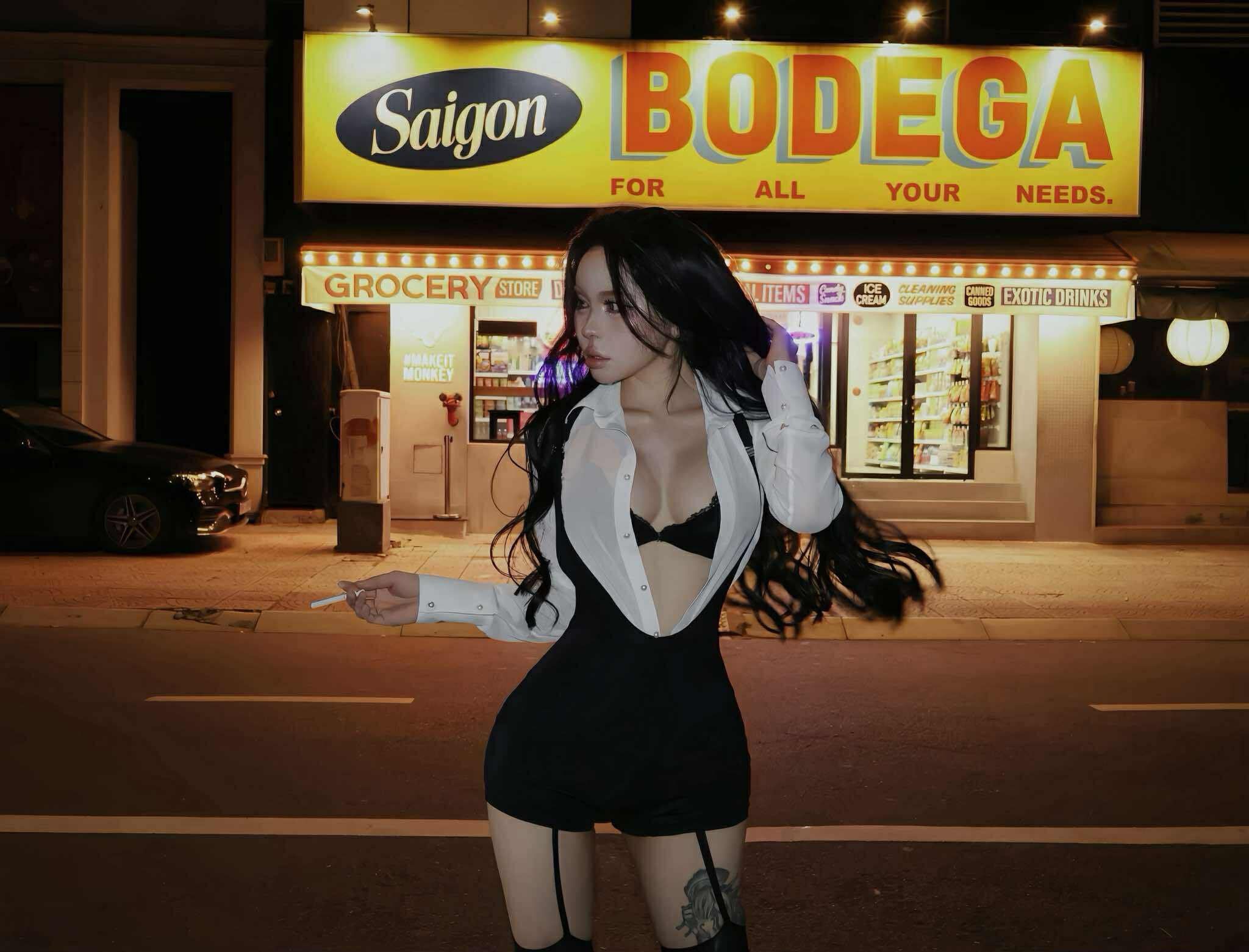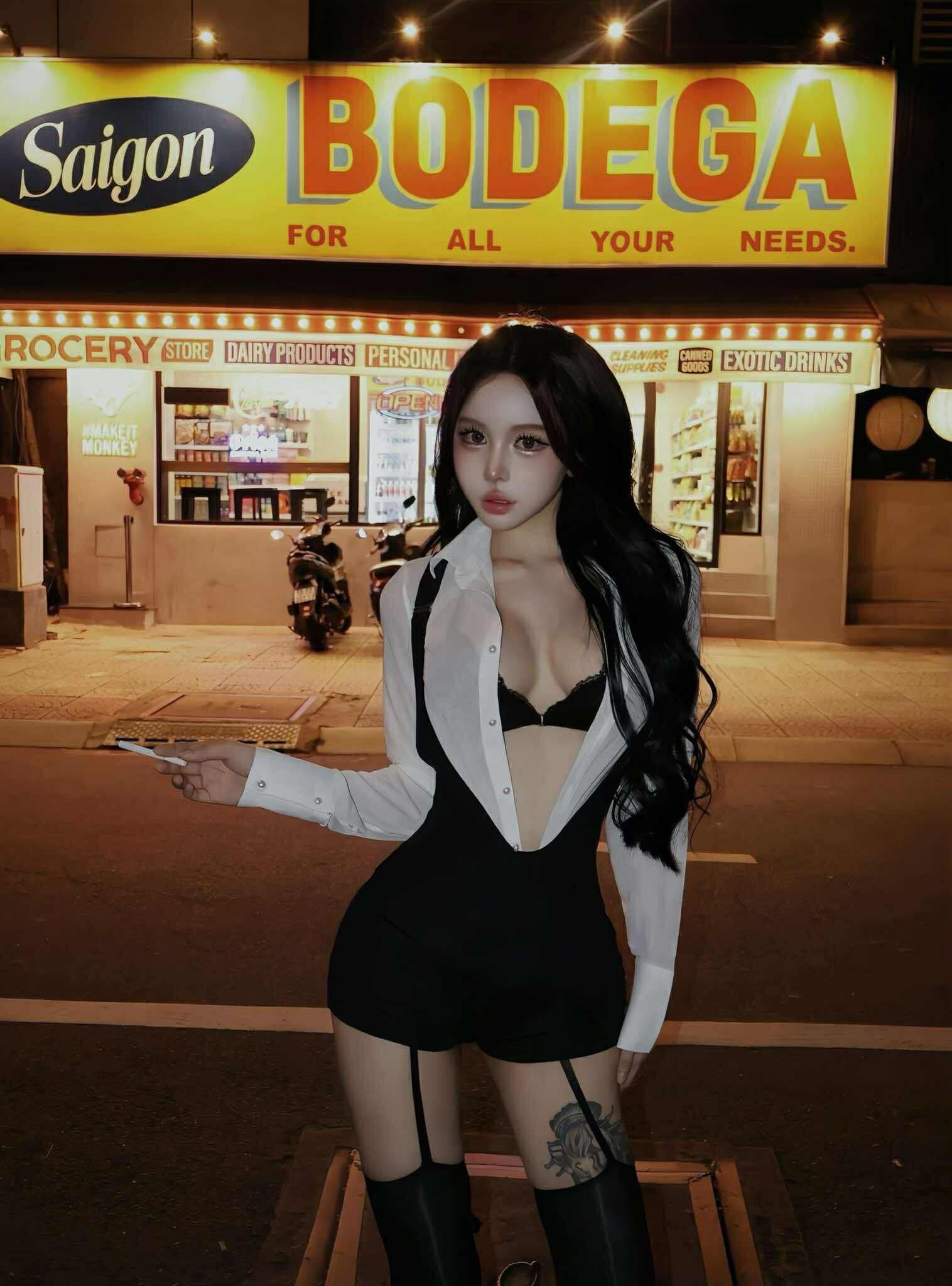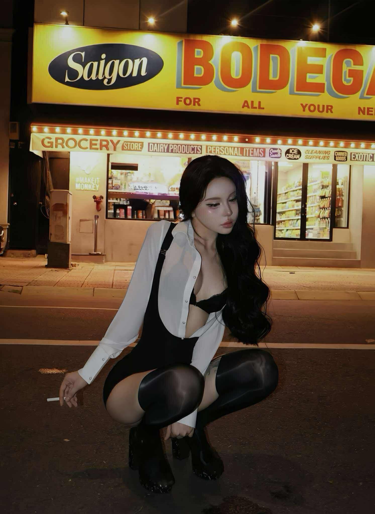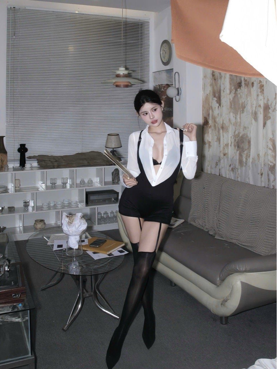 • Áo sơ mi mỏng (trắng/đen): Thiết kế dáng ôm nhẹ, chất liệu voan sheer mềm mại, tạo hiệu ứng gợi cảm đầy bí ẩn. Cổ bẻ và tay dài với khuy cài tinh tế, vừa thanh lịch vừa quyến rũ.